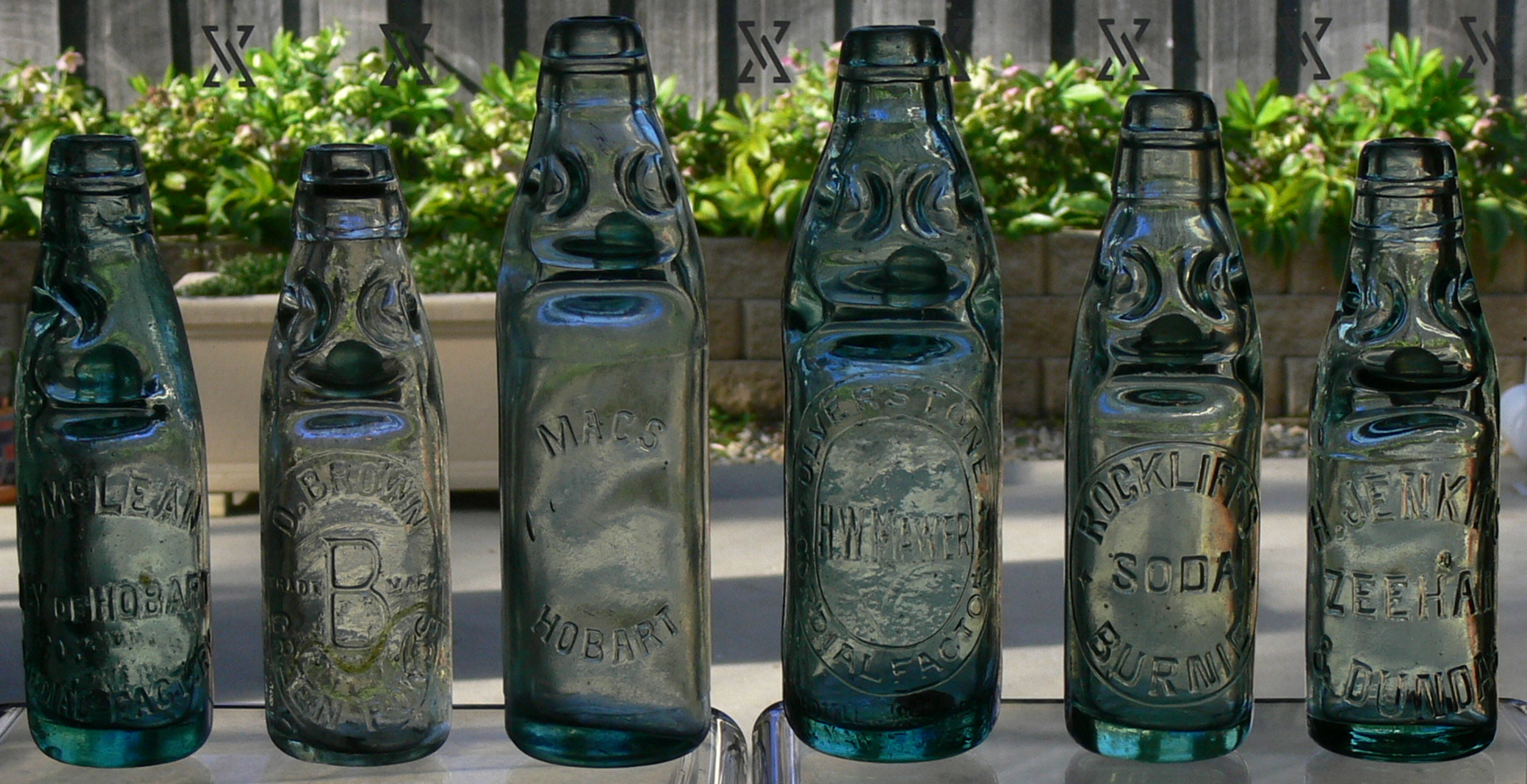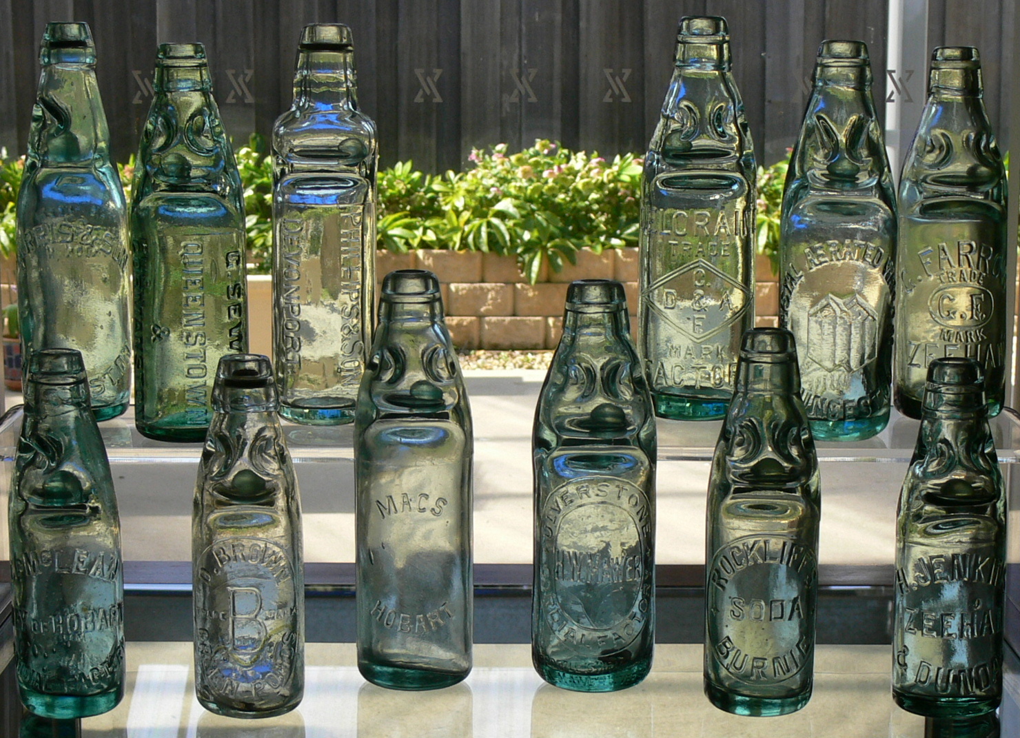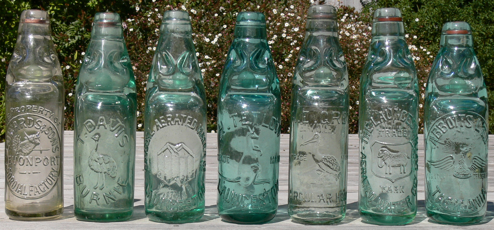 The various array of codd bottles (bottles with internal marble closures) from different parts of Tasmania