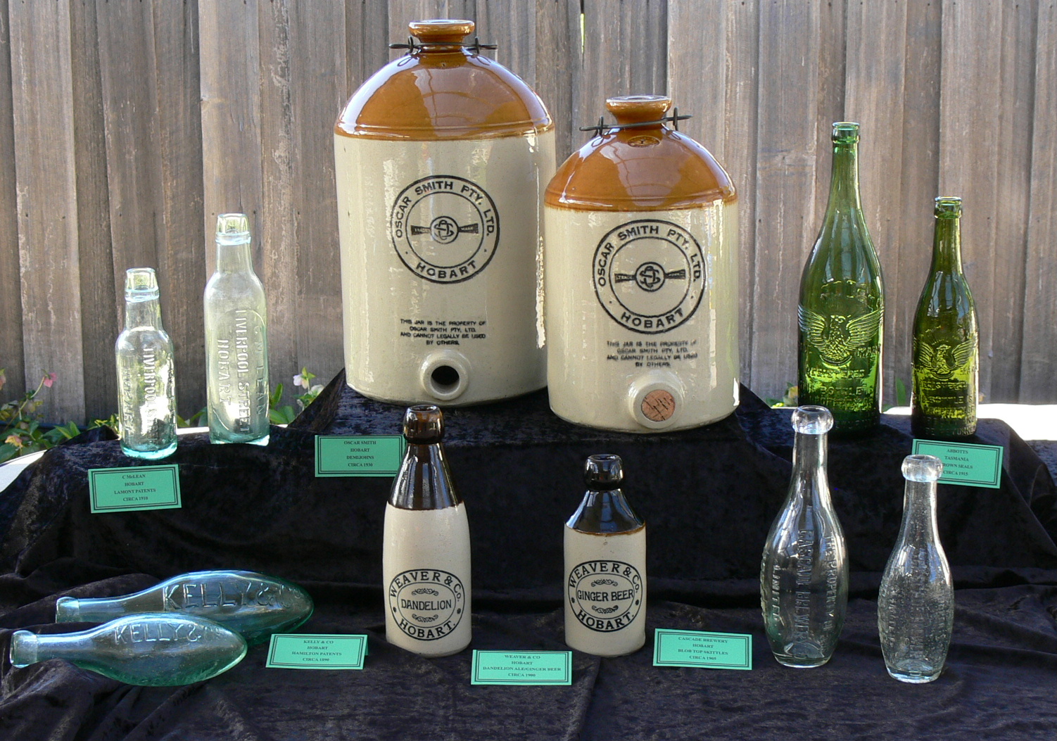 The various array of codd bottles (bottles with internal marble closures) from different parts of Tasmania